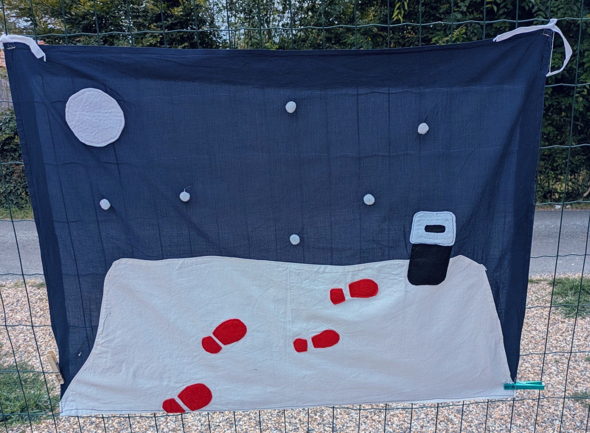 Décor de théâtre de marionnette pour spectacle de Noël réalisé en 2018. Carré de coton bleu nuit agrementé d'un toit de maison et d'empreintes de bottes.