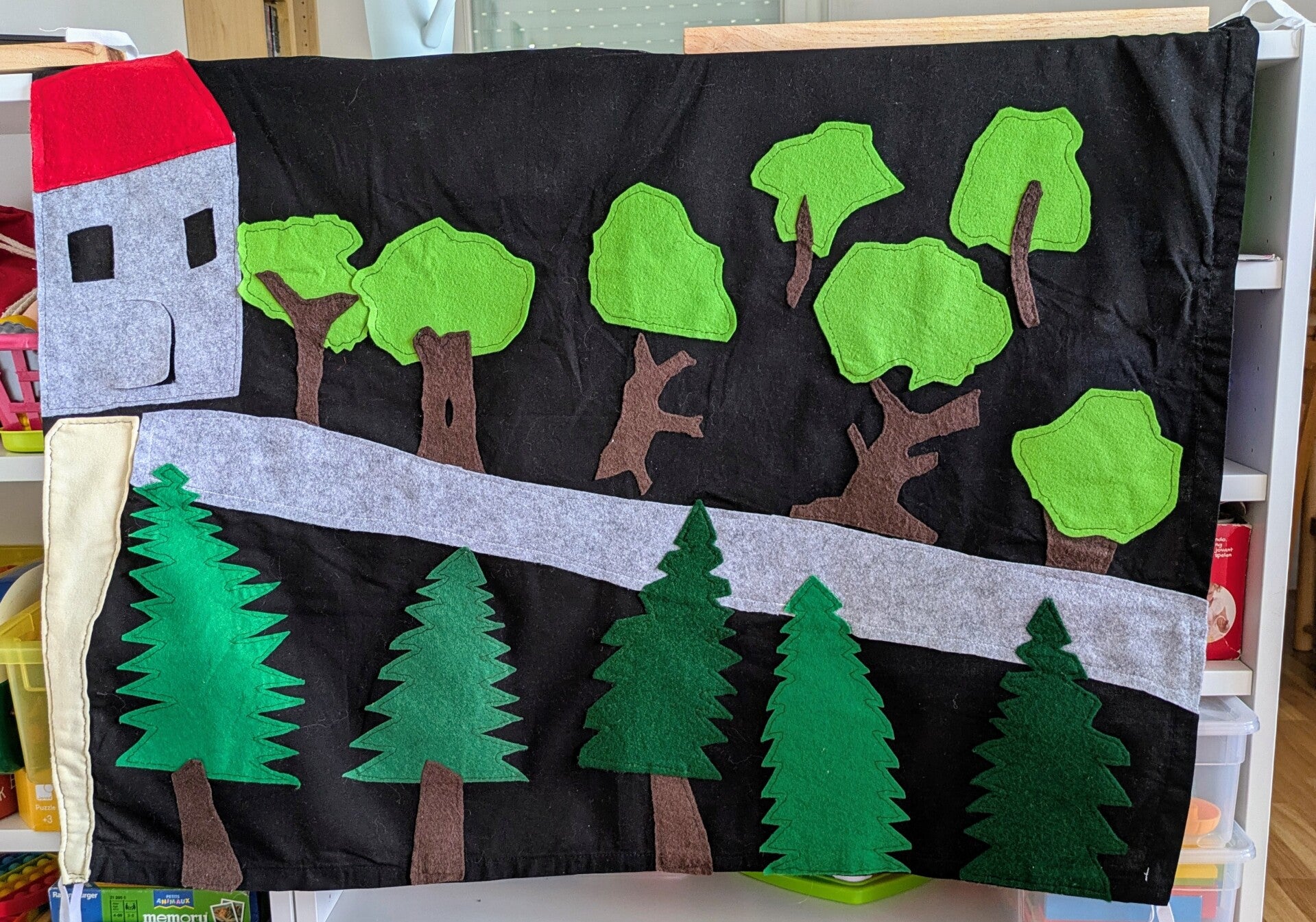 Une maison grise au toit rouge, nichée au cœur d’arbres en feutrine sur fond noir. Un décor doux et mystérieux.